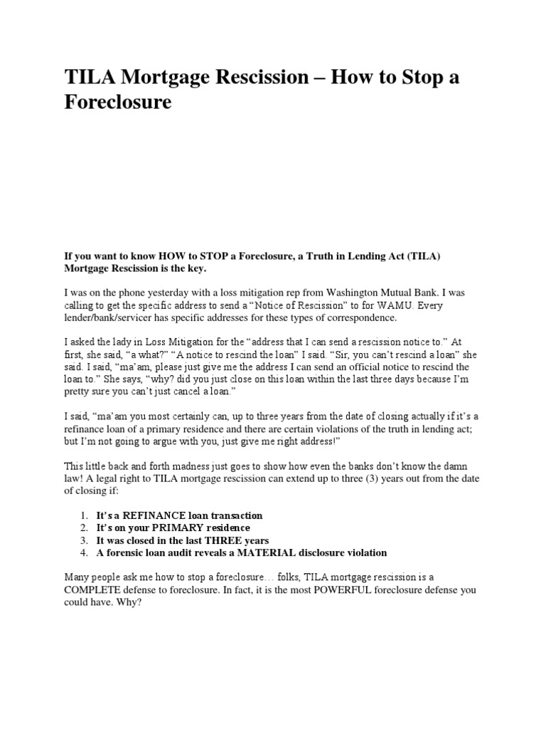 Tila Mortgage Rescission Rescission Foreclosure