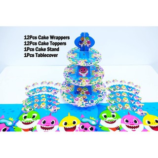 Baby Shark Cake Stand Tablecover Baby Shark Cupcake Toppers And Wrappers Of 12 Set Baby Shark Ta